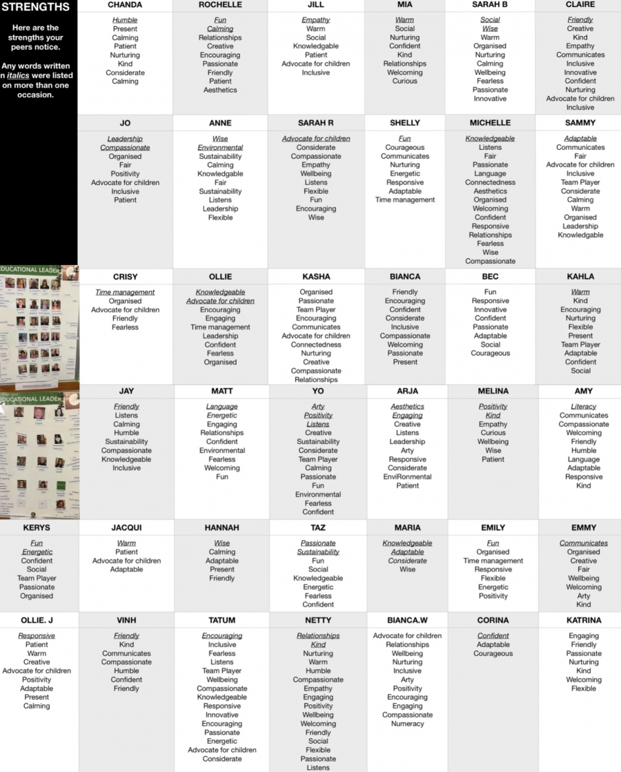 Over the last month I created an interactive display on our staffroom whiteboard with photos of all our permanent and relief MICCC staff and lots of magnets with strength-based words. The idea of the game was to encourage staff to put two words under each staff member, which is quite tricky when there are so many words to choose from. The conversations that unfolded in the staffroom were so amazing as people were identifying and justifying the greatness of those they work with. Whenever the board was full I took a photo and reset it, then new strength identification conversations began with different staff. It has been one of my favourite interactive experiences and really lifted people to view themselves through the eyes of others and realise they have more strengths than they may have thought.